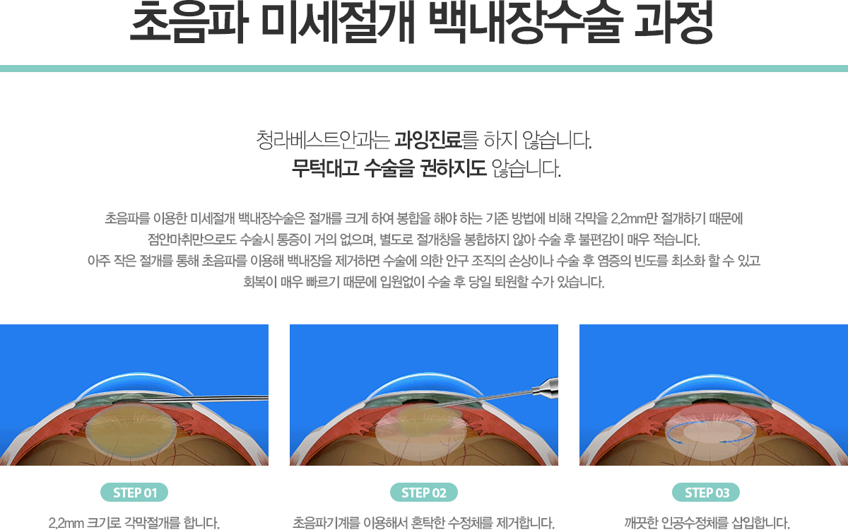 Àý°³¸¦ Å©°Ô ÇÏ¿© ºÀÇÕÀ» ÇØ¾ß ÇÏ´Â ±âÁ¸ ¹æ¹ý¿¡ ºñÇØ °¢¸·À» 2.2mm¸¸ Àý°³Çϱ⠶§¹®¿¡ Á¡¾È¸¶Ã븸À¸·Îµµ ¼ö¼ú½Ã ÅëÁõÀÌ °ÅÀÇ ¾øÀ¸¸ç, º°µµ·Î Àý°³Ã¢À» ºÀÇÕÇÏÁö ¾Ê¾Æ ¼ö¼ú ÈÄ ºÒÆí°¨ÀÌ ¸Å¿ì Àû½À´Ï´Ù. ¾ÆÁÖ ÀÛÀº Àý°³¸¦ ÅëÇØ ÃÊÀ½ÆÄ¸¦ ÀÌ¿ëÇØ ¹é³»ÀåÀ» Á¦°ÅÇÏ¸é ¼ö¼ú¿¡ ÀÇÇÑ ¾È±¸ Á¶Á÷ÀÇ ¼Õ»óÀ̳ª ¼ö¼ú ÈÄ ¿°ÁõÀÇ ºóµµ¸¦ ÃÖ¼ÒÈ ÇÒ ¼ö ÀÖ°í ȸº¹ÀÌ ¸Å¿ì ºü¸£±â ¶§¹®¿¡ ÀÔ¿ø¾øÀÌ ¼ö¼ú ÈÄ ´çÀÏ Åð¿øÇÒ ¼ö°¡ ÀÖ½À´Ï´Ù.