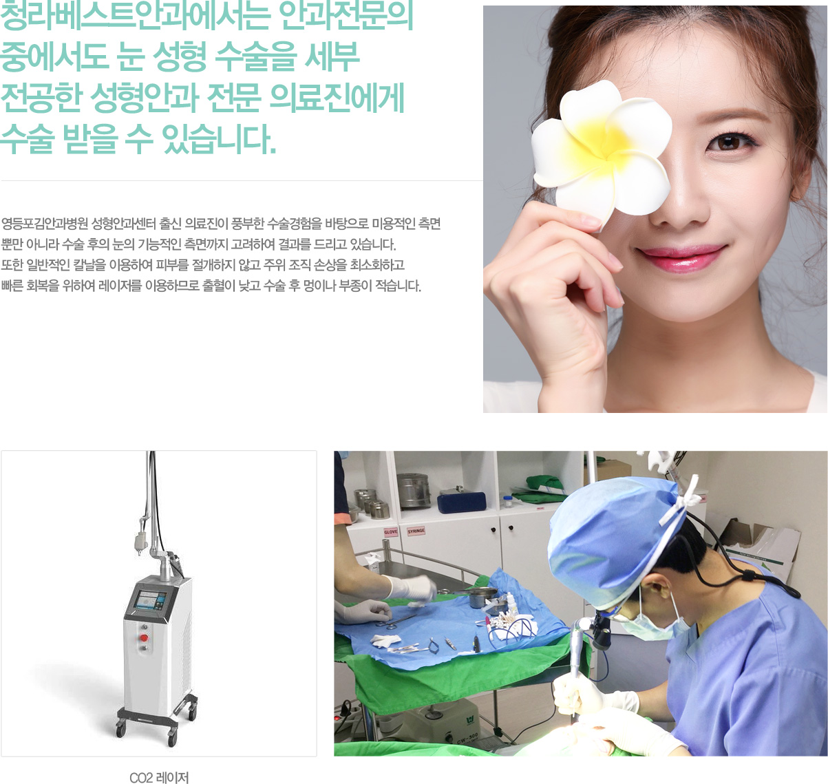 û¶óº£½ºÆ®¾È°ú¿¡¼´Â ¾È°úÀü¹®ÀÇ Áß¿¡¼µµ ´« ¼ºÇü ¼ö¼úÀ» ¼¼ºÎ Àü°øÇÑ ¼ºÇü¾È°ú Àü¹® ÀÇ·áÁø¿¡°Ô ¼ö¼ú ¹ÞÀ» ¼ö ÀÖ½À´Ï´Ù. ¿µµîÆ÷±è¾È°úº´¿ø ¼ºÇü¾È°ú¼¾ÅÍ Ãâ½Å ÀÇ·áÁøÀÌ Ç³ºÎÇÑ ¼ö¼ú°æÇèÀ» ¹ÙÅÁÀ¸·Î ¹Ì¿ëÀûÀÎ Ãø¸é »Ó¸¸ ¾Æ´Ï¶ó ¼ö¼ú ÈÄÀÇ ´«ÀÇ ±â´ÉÀûÀÎ Ãø¸é±îÁö °í·ÁÇÏ¿© ÃÖ»óÀÇ °á°ú¸¦ µå¸®°í ÀÖ½À´Ï´Ù. ¶ÇÇÑ ÀϹÝÀûÀÎ Ä®³¯À» ÀÌ¿ëÇÏ¿© ÇǺθ¦ Àý°³ÇÏÁö ¾Ê°í ÁÖÀ§ Á¶Á÷ ¼Õ»óÀ» ÃÖ¼ÒÈÇÏ°í ºü¸¥ ȸº¹À» À§ÇÏ¿© ·¹ÀÌÀú¸¦ ÀÌ¿ëÇϹǷΠÃâÇ÷ÀÌ ³·°í ¼ö¼ú ÈÄ ¸ÛÀ̳ª ºÎÁ¾ÀÌ Àû½À´Ï´Ù.