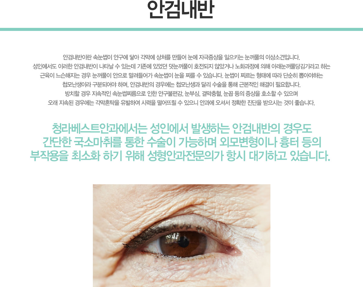 ¾È°Ë³»¹ÝÀ̶õ ¼Ó´«½çÀÌ ¾È±¸¿¡ ´ê¾Æ °¢¸·¿¡ »óó¸¦ ¸¸µé¾î ´«¿¡ ÀÚ±ØÁõ»óÀ» ÀÏÀ¸Å°´Â ´«²¨Ç®ÀÇ ÀÌ»ó¼Ò°ßÀÔ´Ï´Ù. ¼ºÀο¡¼µµ ÀÌ·¯ÇÑ ¾È°Ë³»¹ÝÀÌ ³ªÅ¸³¯ ¼ö Àִµ¥ ±âÁ¸¿¡ ÀÖ¾ú´ø µ¡´«²¨Ç®ÀÌ È£ÀüµÇÁö ¾Ê¾Ò°Å³ª ³ëȰúÁ¤¿¡ ÀÇÇØ ¾Æ·¡´«²¨Ç®´ç±è±â¶ó°í ÇÏ´Â ±ÙÀ°ÀÌ ´À½¼ÇØÁö´Â °æ¿ì ´«²¨Ç®ÀÌ ¾ÈÀ¸·Î ¸»·Áµé¾î°¡ ¼Ó´«½çÀÌ ´«À» Â ¼ö ÀÖ½À´Ï´Ù. ´«½çÀÌ Â´Â ÇüÅ¿¡ µû¶ó ´Ü¼øÈ÷ »Ì¾Æ¾ßÇϴ ø¸ð³»ýÀÌ¶ó ±¸ºÐµÇ¾î¾ß Çϸç, ¾È°Ë³»¹ÝÀÇ °æ¿ì¿¡´Â ø¸ð³»ý°ú ´Þ¸® ¼ö¼úÀ» ÅëÇØ ±Ùº»ÀûÀÎ ÇØ°áÀÌ ÇÊ¿äÇÕ´Ï´Ù. ¹æÄ¡ÇÒ °æ¿ì Áö¼ÓÀûÀÎ ¼Ó´«½çÂÀ¸·Î ÀÎÇÑ ¾È±¸ºÒÆí°¨, ´«ºÎ½É, °á¸·ÃæÇ÷, ´«²Å µîÀÇ Áõ»óÀ» È£¼ÒÇÒ ¼ö ÀÖÀ¸¸ç ¿À·¡ Áö¼ÓµÈ °æ¿ì¿¡´Â °¢¸·È¥Å¹À» À¯¹ßÇÏ¿© ½Ã·ÂÀ» ¶³¾î¶ß¸± ¼ö ÀÖÀ¸´Ï ¾È°ú¿¡ ¿À¼Å¼ Á¤È®ÇÑ Áø´ÜÀ» ¹ÞÀ¸½Ã´Â °ÍÀÌ ÁÁ½À´Ï´Ù. û¶óº£½ºÆ®¾È°ú¿¡¼´Â ¼ºÀο¡¼ ¹ß»ýÇÏ´Â ¾È°Ë³»¹ÝÀÇ °æ¿ìµµ °£´ÜÇÑ ±¹¼Ò¸¶Ã븦 ÅëÇÑ ¼ö¼úÀÌ °¡´ÉÇÏ¸ç ¿Ü¸ðº¯ÇüÀ̳ª ÈäÅÍ µîÀÇ ºÎÀÛ¿ëÀ» ÃÖ¼ÒÈ Çϱâ À§ÇØ ¼ºÇü¾È°úÀü¹®Àǰ¡ Ç׽à ´ë±âÇϰí ÀÖ½À´Ï´Ù.